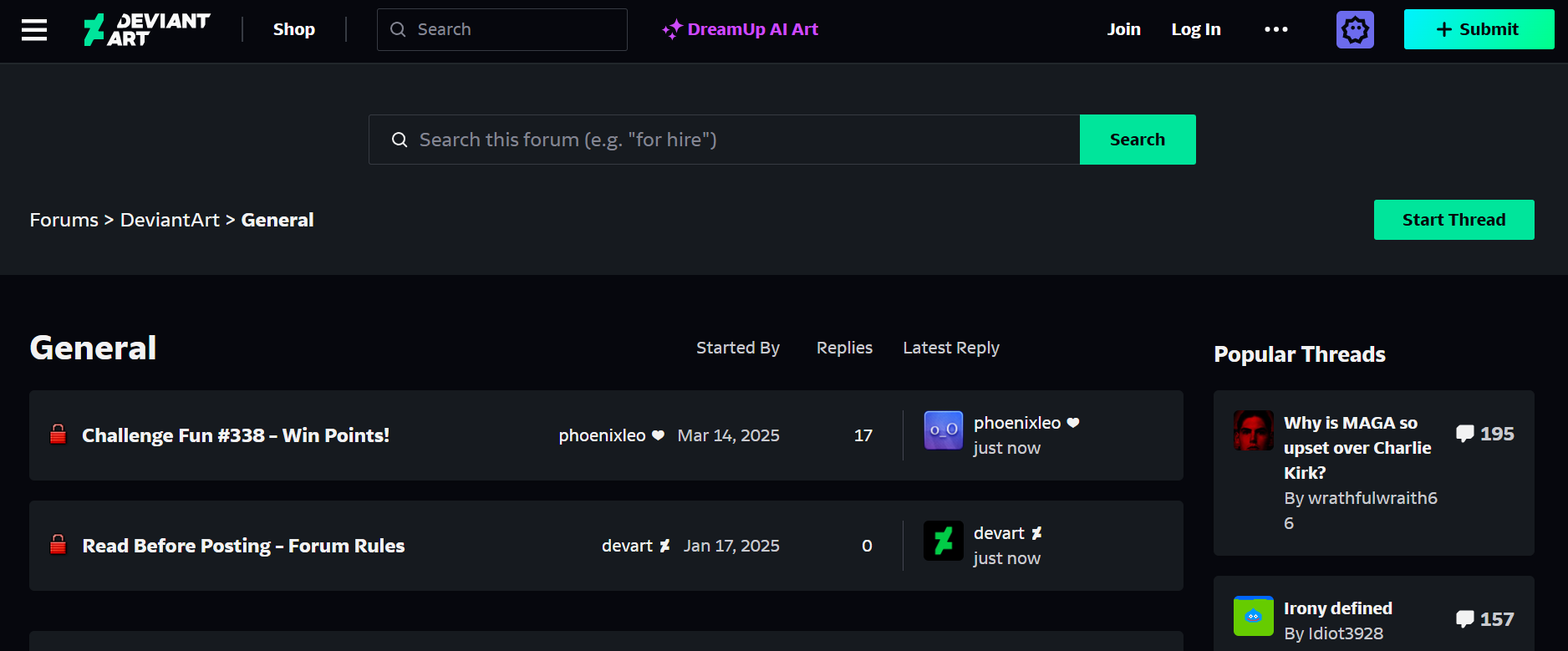 DeviantArt hosts diverse discussion groups for general topics, art challenges, general, etc